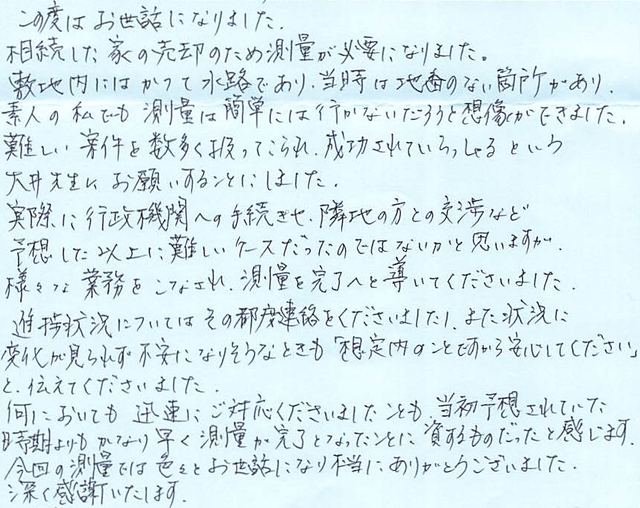 開始から最終登記完了まで予想以上の半年が経過しましたが、調査測量開始時から丁寧にご対応頂き、進捗状況も適時ご報告をいただき安心してお任せすることができました。