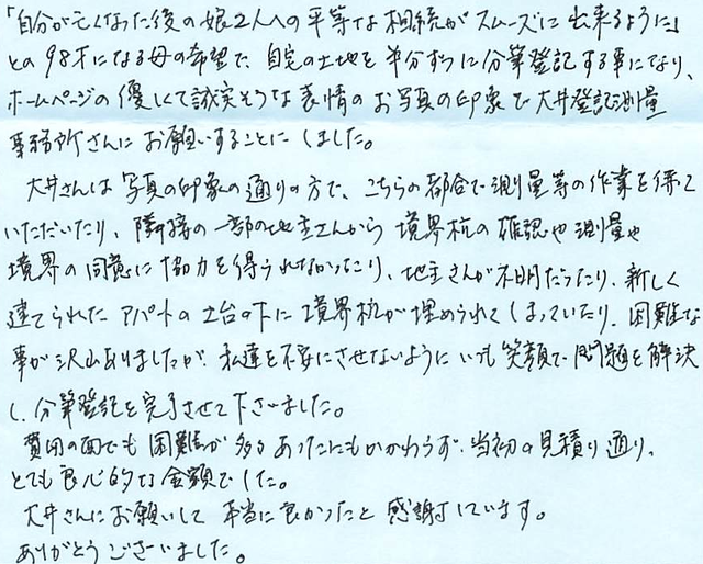 「自分が亡くなった後の娘二人への平等な相続がスムーズに出来るように」との98才になる母の希望で自分の土地を半分ずつに分筆登記する事になり、ホームページの優しくて誠実そうな表情のお写真の印象で大井登記測量事務所さんにお願いすることにしました。