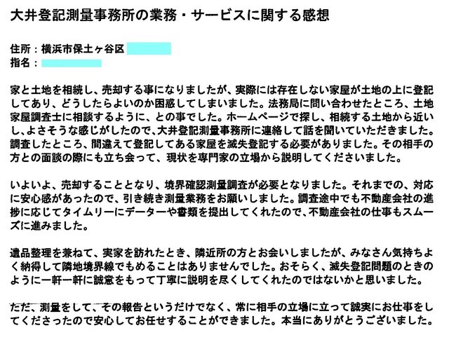 素人の当方の勉強不足もありますが、大井登記測量事務所様の「公正明大」なお仕事ぶりに感謝する次第です。今後も友人や知人にもご紹介させていただきます。有り難うございました。